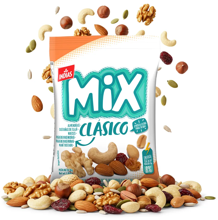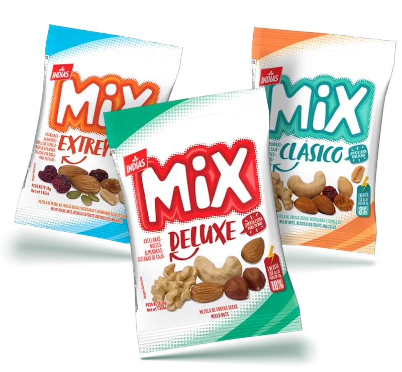 Nuestros MIX combinan frutos secos, semillas y frutas deshidratadas en porciones de 30 g, ideales para el snack diario o una pausa nutritiva.