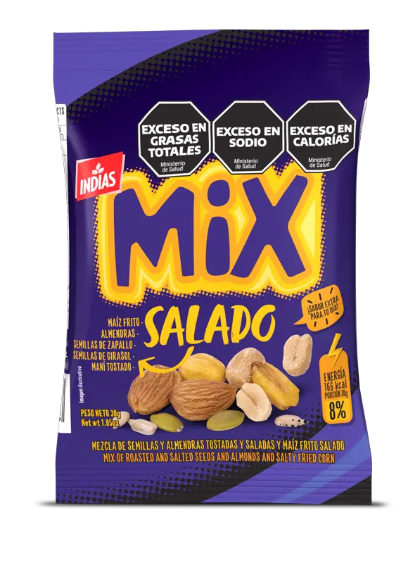 Contiene: Maíz frito, almendras, semillas de zapallo, semillas de griasol y maní tostado.